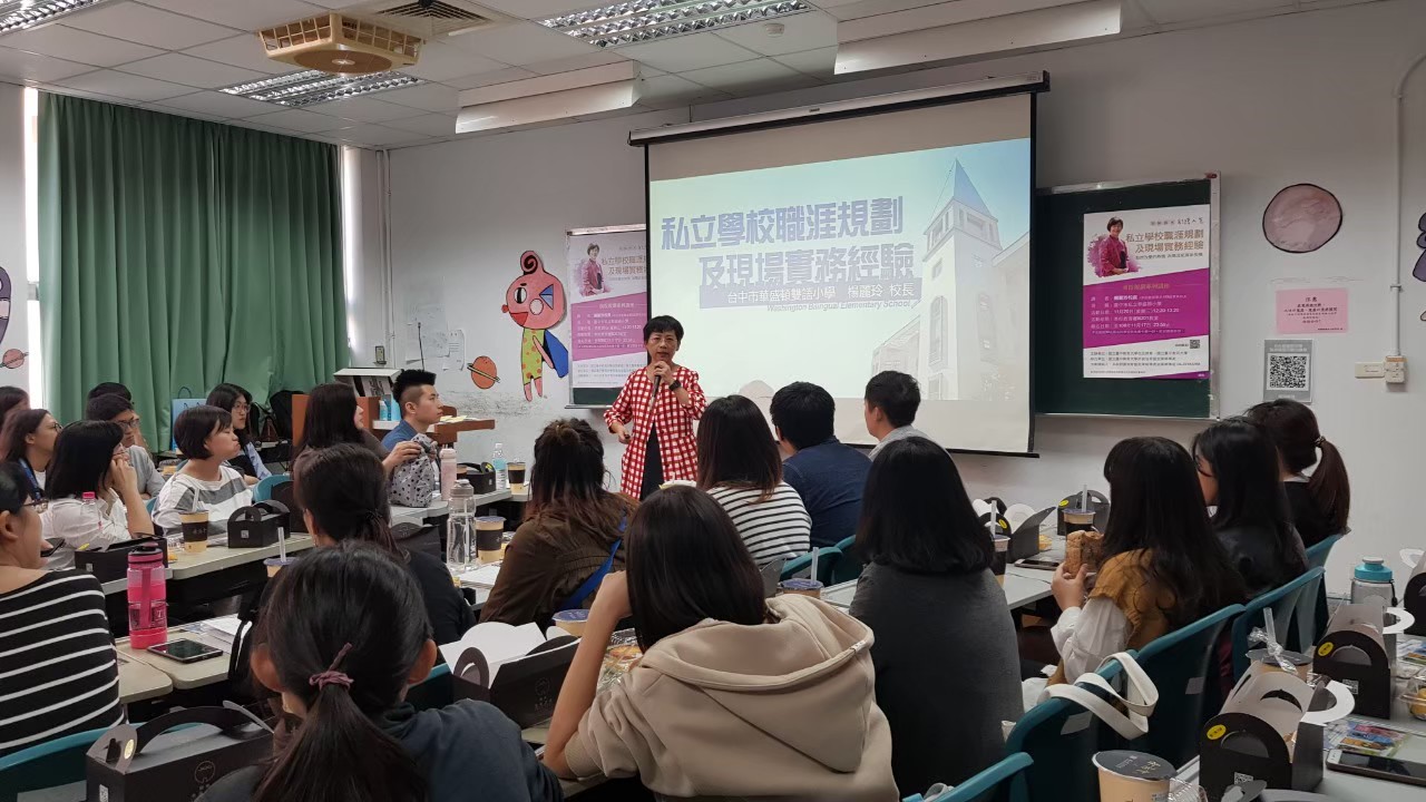 時間:11/20(三)12:20-13:20 地點:教育樓B207 講師:臺中市私立華盛頓國民小學楊麗玲校長